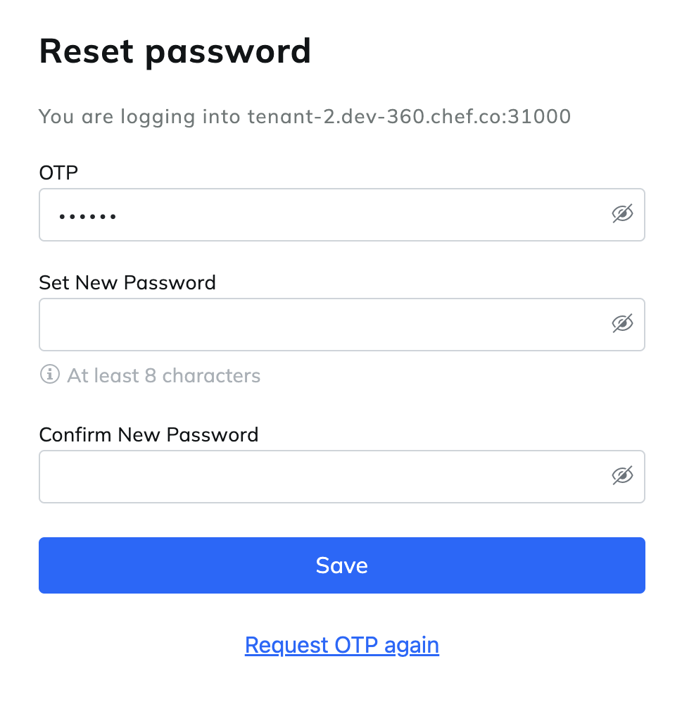 After you install and configure Chef 360 Platform, it sends an email with a link to set an administrator password. You have five minutes to open the link in the email and set the password. If your one-time password expires, you can create a new one.